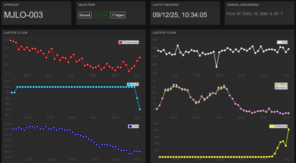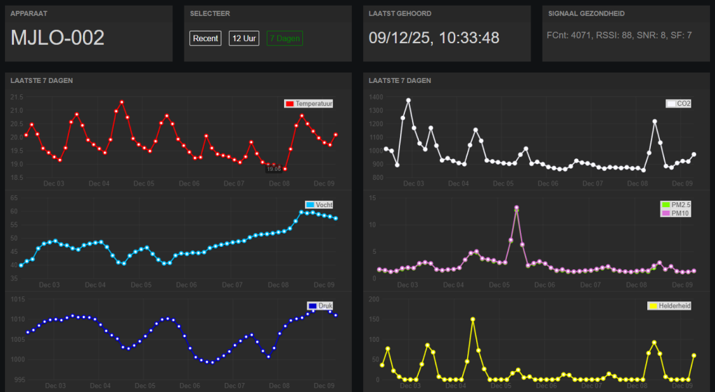 Zoek via het zoekveld in de menubalk op het nummer van je kastje (bijvoorbeeld: MJLO-002). Hiermee kom je op de pagina met recente data van jouw kastje. Hier kun je kiezen voor de nieuwste meetresultaten, of grafiekjes van de afgelopen 12 uur en 7 dagen. Ook zie je hier hoe vol de accu van het kastje ongeveer is en wanneer het laatste berichtje is ontvangen.